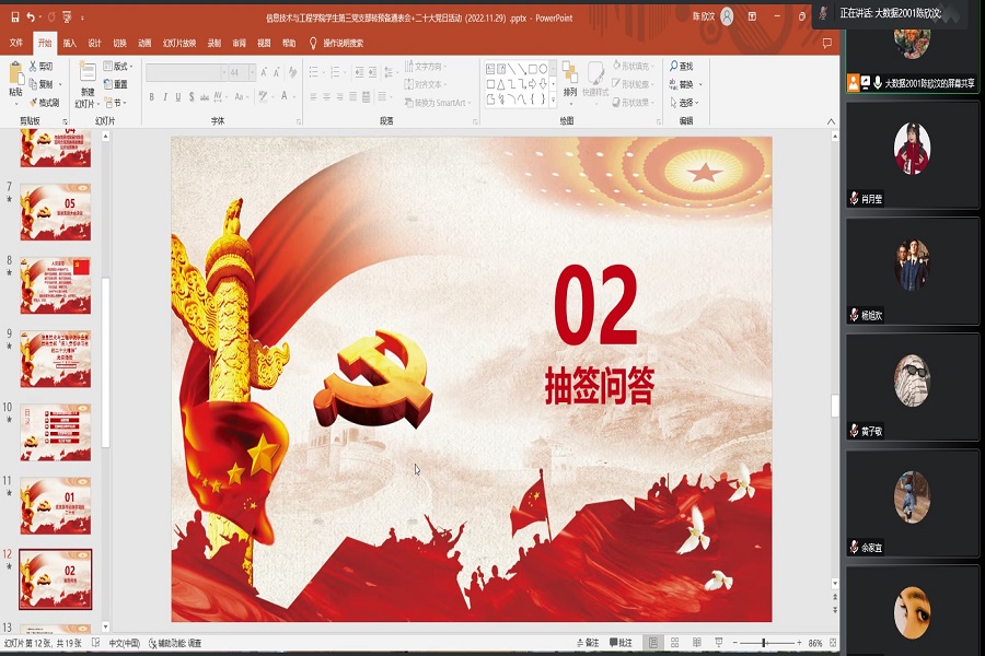 为学习宣传贯彻党的二十大精神,弘扬伟大建党精神。11月29日公司员工第三党支部以线上方式开展“学习宣传贯彻党的二十大精神”主题党日。出席本次活动的有党支部书记朱国华同志,教师党员陈钰纯同志、胡舒娅同志以及全体员工党员同志。本次活动由陈欣汶同志主持。