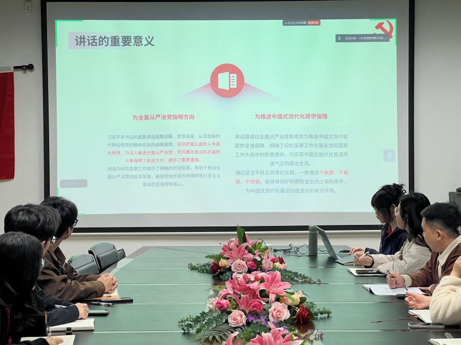 会议第二项由策划组孟清莹分别从全会背景及意义、全面从严治党取得的新进展新成效等讲述了习近平总书记在二十届中央纪委四次全会上的重要讲话精神。讲话站在全局战略高度,对深化纪检监察体制改革提出了明确要求,为深入推进全面从严治党、党风廉政建设和反腐败斗争指明了前进方向、提供了重要遵循。此外,青年必须深入学习贯彻习近平总书记重要讲话精神,深刻理解党中央关于当前反腐败斗争形势仍然严峻复杂,不断提高政治站位,坚定打好反腐败斗争攻坚战、持久战、总体战的坚强决心和必胜信心。