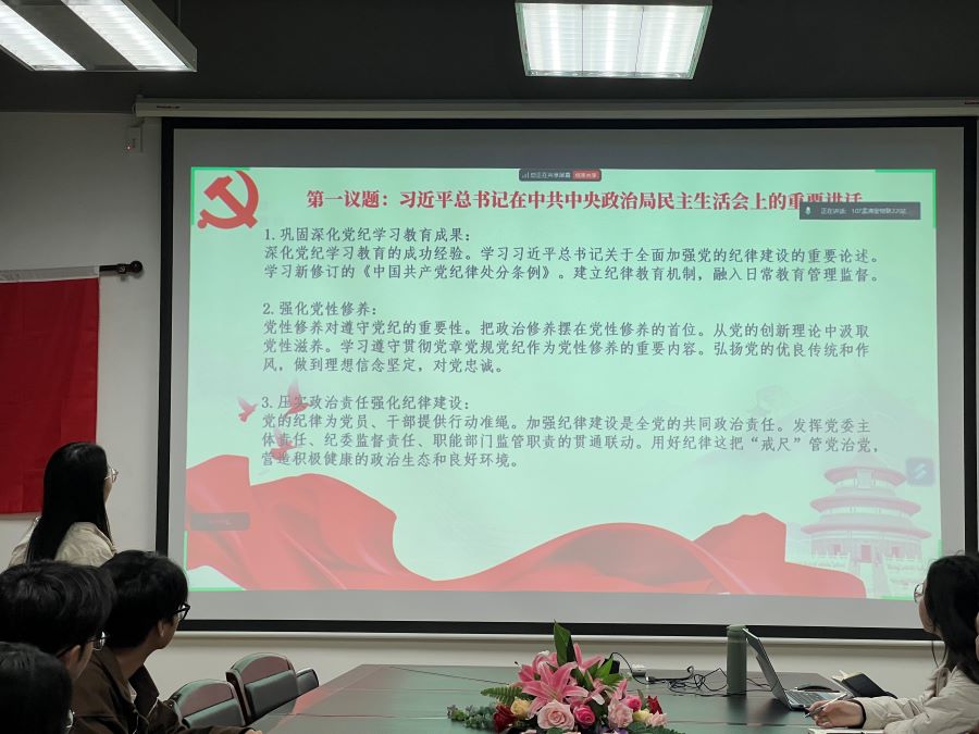 会议落实“第一议题”制度,由学案组罗楚怡领学习近平总书记在中共中央政治局民主生活会上的重要讲话学习心得。习近平总书记在中央政治局民主生活会上的重要讲话,从深化党的自我革命、推动全面从严治党向纵深发展的战略全局高度,对巩固深化党纪学习教育成果、强化党性修养、压实政治责任强化纪律建设提出明确要求,为我们在新征程上全面加强党的纪律建设指明了前进方向。
