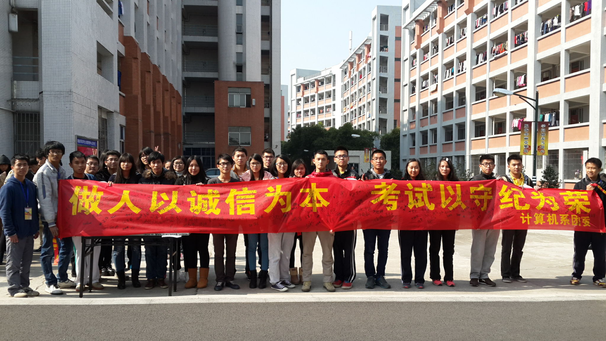 岁月无声,悄悄的期末临近了。为了宣传和发扬“做人以诚信为本,考试以守纪为荣”的良好品德。2013年12月24日11点15分,计算机系团委在舞蹈室对面举行了诚信考试签名活动。