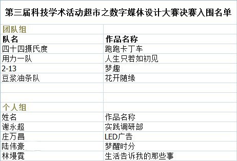 随着社会的发展,数码技术在不断提高,数字生活已经成为社会的主流,在此契机下计算机系团委响应党中央提出的“创先争优”的伟大号召,切合公司“一体两翼”的教学方针,以“转变员工学习方式”为目的,本着“为科技爱好者打造闪亮舞台”的宗旨,承办了此次科技学术超市之数字媒体设计大赛。第三届数字媒体设计大赛决赛的入围具体名单公示如下:(排名不分先后)