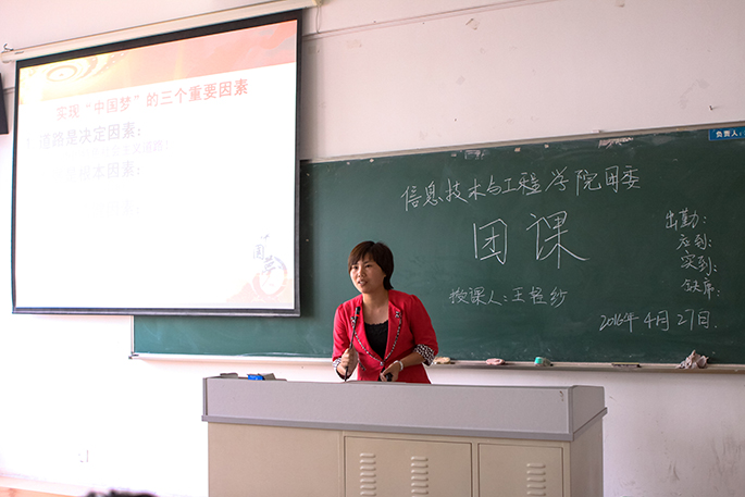 课堂上,王轻纱老师首先介绍中国梦的内涵,指出实现中国梦就是要实现国家富强、民族振兴、人民幸福,千千万万的个人梦汇聚成了中国梦,而个人梦想的实现就是实现自我的价值。接着,她提出了实现梦想的关键因素是实干,建立目标并付出实际行动,不断达到一个个目标进而实现梦想。此外,她还强调每个人都要有责任心,不能把失败的责任归咎于客观原因,应该通过自己的能力去解决问题。台下的同学们在老师的讲课中时而认真做笔记,时而陷入思考中。最后,郑泽成同学带领在场人员大声歌唱了团歌,他还创新性地指出“团”是由“口”和“才”组成的,团员干部应该要懂得与他人沟通,不断地提高自身才能。至此,本次团课也圆满地结束。