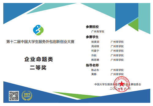 在公司领导和教务处的大力支持下,在公司领导的指导下,伟德国际1946bv官网由陈必东、黄静老师指导的“闷声发大财”团队姚庚润、周翊锦、何嘉宁、许航、熊若珊的作品“好租易——智能租赁平台”获得中部区域赛决赛一等奖,以广东省A类赛题唯一获得一等奖的高校团队进入全国决赛。在全国决赛中,经过激励的竞争,“闷声发大财”团队最终获得全国决赛二等奖的优异成绩,充分展示了bevictor1946韦德官网学子奋力拼搏、积极创新的风采。