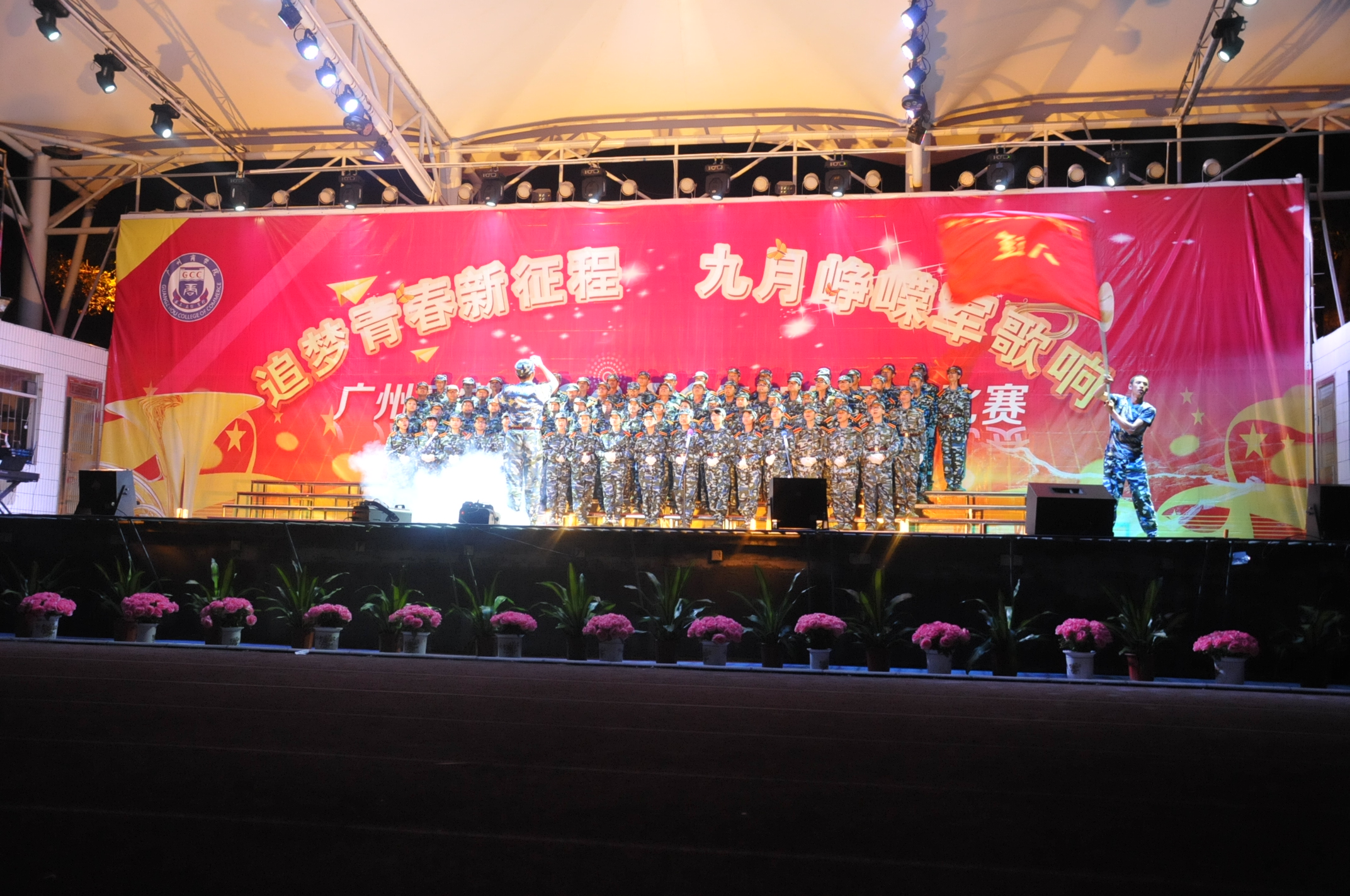 经过烈日的考验和艰苦的训练后,新生们终于迎来了在军训中最欢快的晚会——军歌晚会。这是一场极致精彩的表演,参与的所有成员都是由新生们组成,在火辣的开场舞和介绍后,军歌正式开始。