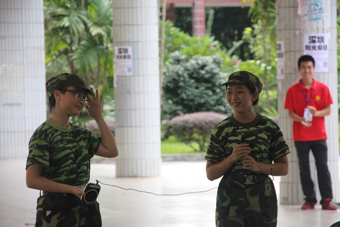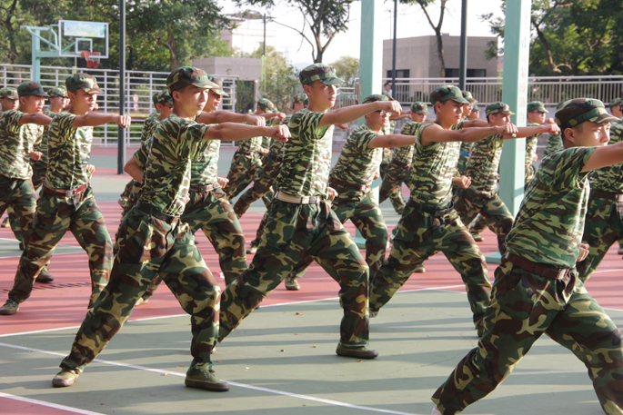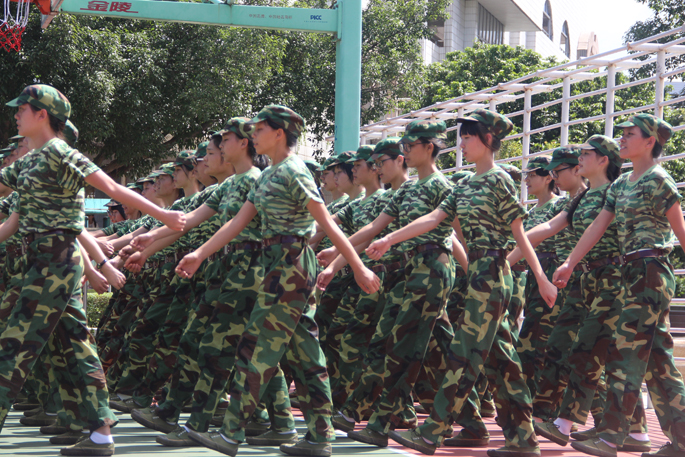 在休息之余,教官首先给同学们分享了其当兵时期的趣事,同学们全神贯注地听着,到精彩之处都不约而同地响起了赞许的掌声。教官以当初其在部队里艰苦训练,力争上游的亲身经历来告诫同学们要严于律己、积极进取,不要有丝毫的松懈才能够进步。接着教官便带领着同学们唱军歌,嘹亮的歌声响彻整个训练场,其间有几位同学勇敢地上前为大家献唱,下面的同学们为歌声所感染,也附和地唱着。休息过后,新生们又投入了训练当中,女生方队的新生走着坚定的齐步,训练场上响起其嘹亮的口号;男生方队方面在教官的带领下练习军体拳,同学们身姿挺拔,气势十足。
