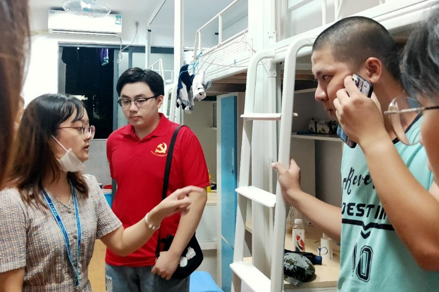 走访期间,党支部成员们询问并且了解到了新生的校园生活体验以及生活学习上遇到的难题,向新生们介绍员工党支部的基本情况。对于即将开始的老员工活,辅导员老师提到了新生宿舍安全问题,要收拾好贵重物品,出门注意锁门,平时记得通风保持空气流通等;对于正在进行中的军训,辅导员老师则强调要做好心理建设,适当加强锻炼。