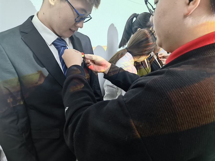 由支部正式党员为新发展的预备党员佩戴党员徽章。通过佩戴党员徽章,让各位预备党员亮身份,树形象,做表率,始终不忘党员身份,发挥先锋模范作用。