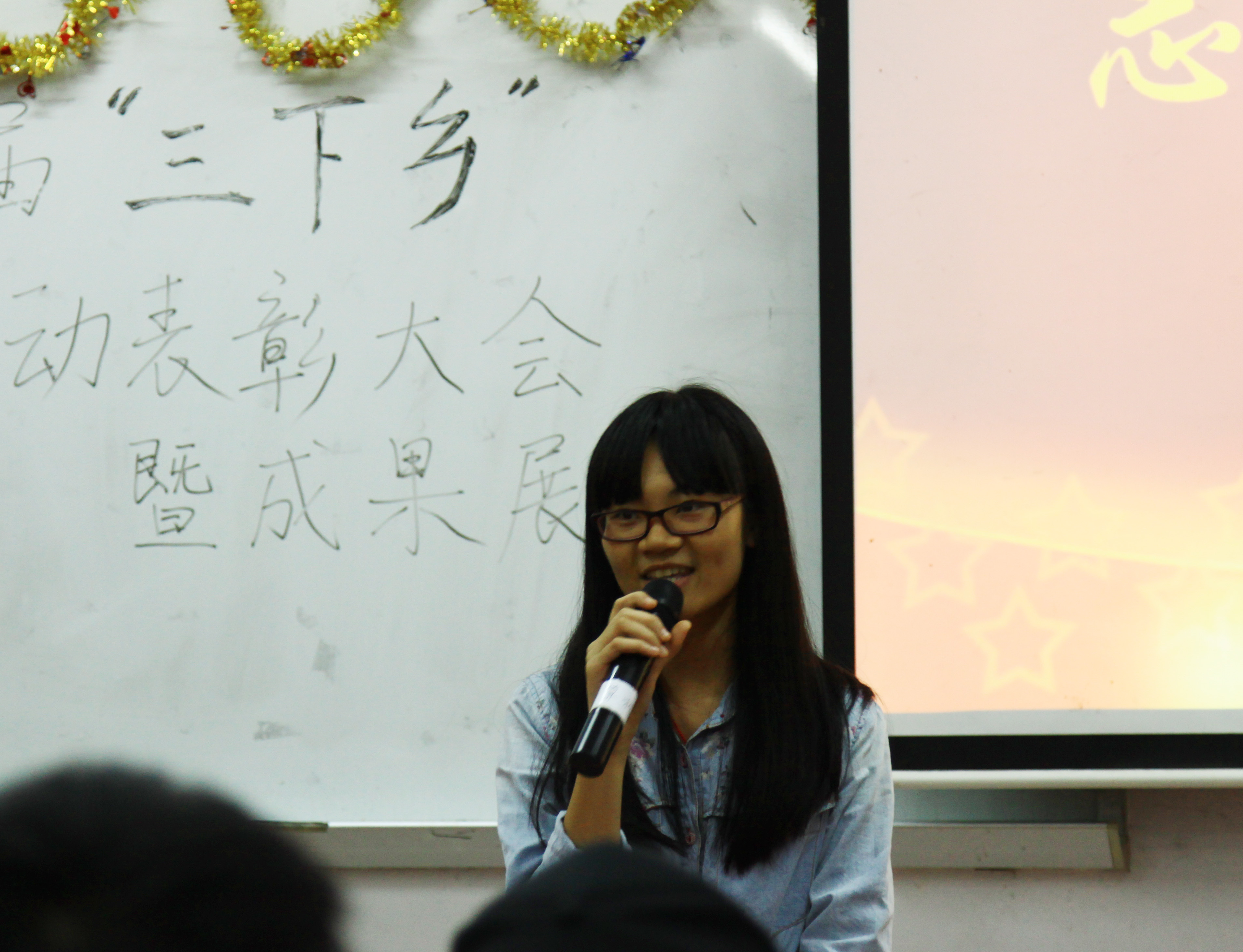 大会开始前夕,一个凝聚着我系三下乡服务队员们在今年暑假三下乡活动中点点滴滴的视频感动上映,带领在场的观众们回顾了那些天的各种美好的回忆。随后,三下乡服务队队长麦丽仪同学进行发言,讲述了三下乡带给她无数难忘的回忆以及当地的孩子给队员们留下的种种印象;还指出了下乡活动中的不足和需要改进的地方。紧接着,热烈的掌声中迎来了志愿者代表李晓欣同学上台发表感言,她讲述了三下乡的深刻意义以及带给老员工的是一个锻炼机会,还指出了在活动中人与人之间的沟通交流在下乡中的重要性。