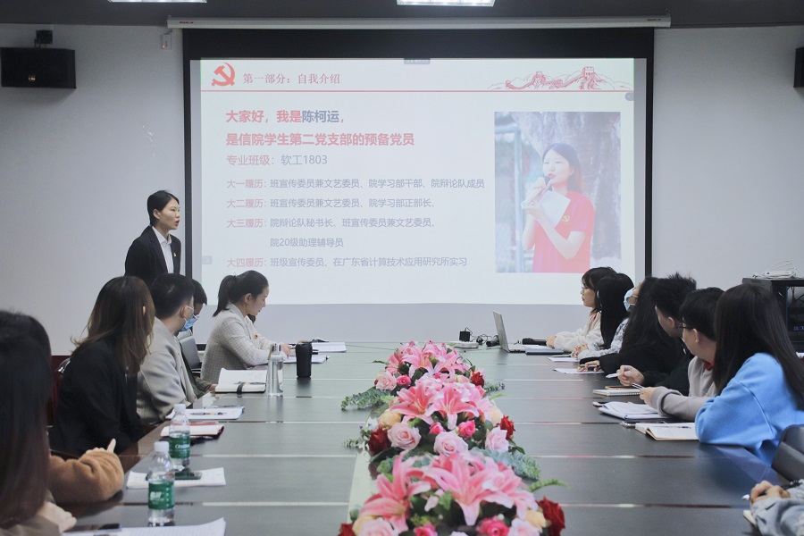 由入党介绍人杨艳美同志分别从政治思想、学习成绩、生活作风等方面介绍预备党员在预备期的表现情况及意见,在对陈徽等8名预备党员的表现表示肯定的同时,着重强调要深入学习理论知识,关注时事政治,与时俱进,牢记党员身份,秉持为人民服务的宗旨,投身社会建设,在实践中磨练坚毅的党员品质。