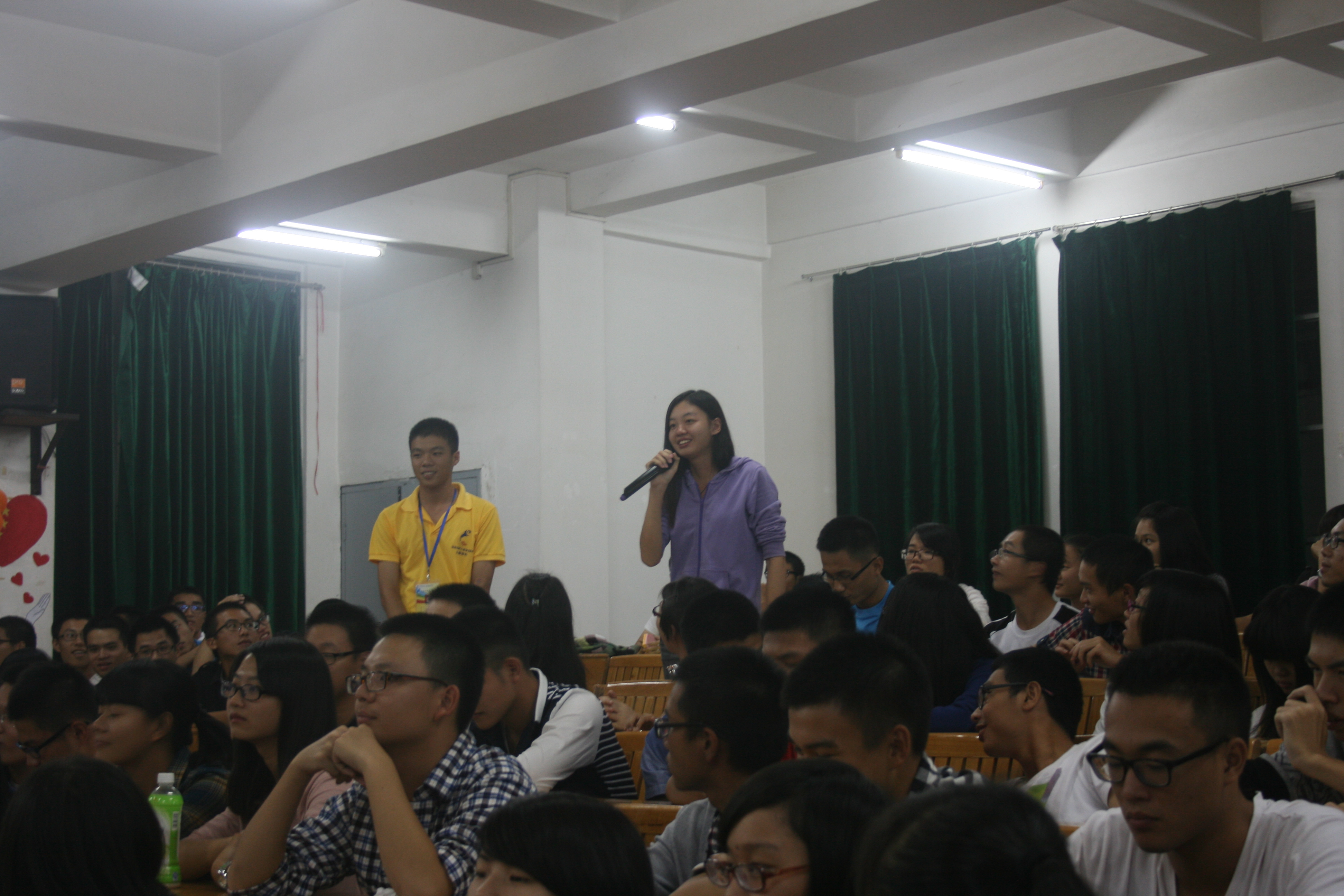 场上场下学员们的心早已交织在一起,《甩甩便利贴》的游戏环节登场了。游戏主持人简单地介绍了游戏规则,在场的观众都迫不及待,跃跃欲试。游戏过程中学员们各具特色的甩贴动作,惹得整场学员们捧腹大笑,气氛十分活跃。作为嘉宾的师兄们也忍不住加入其中,场面的热烈狂潮更是一浪接一浪。时间关系,游戏环节不得不画上了句号。因为本次活动的下一个重点环节已经等待许久——师兄师姐大解惑,13级各班助理辅导员在台上为新生排忧解难。新生们五花八门的问题,师兄师姐们都一一作了详细解答。这让新生们意识到老员工应该合理规划自己的时间,调节好工作与学习之间的关系,确定目标,努力奋进。问答交流环节在两位师兄的歌声和台下观众的陶醉中结束。
