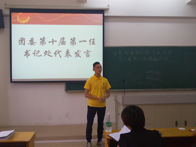会议开始,主持人钟杏燕同学为会议开场致辞,接着带领全体人员起立奏唱团歌。而后,第十届第一任团委副书记郑泽成同学发言,其对王轻纱老师以及第十届第一任干部们过去一年辛勤付出表示感谢,同时寄语新一任团委的干部们,不忘初衷,改进过去一年遗留的问题,传承信息公司团委的优良品质。