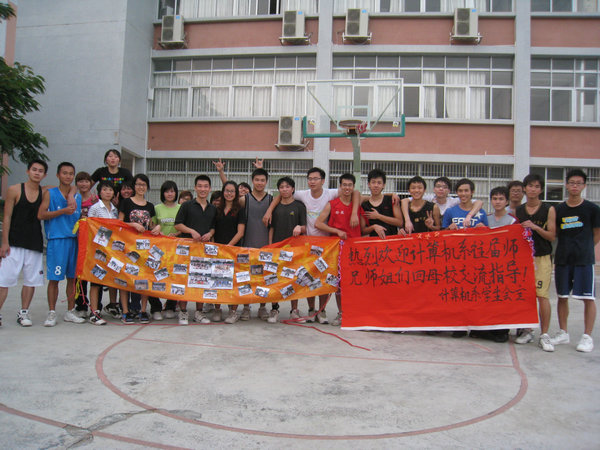 下午16时,一场别开生面的篮球赛精彩上演。对战双方分别是由08、09、10届毕业师兄组成的队伍和由08、09级混合10级新生组成的队伍。哨声响起,角逐拉开,篮球场上矫健的身姿奔越自如,撩人眼花。往届师兄果然经验丰富,实力超强,沉着的应对着每一个惊险的瞬间,不骄不躁,灵活应变。而10级新生也不甘示弱,抢球,投篮,每一个动作都潇洒自如,和同队师兄合作无间,睥睨赛场。时间一分一秒的过去,比分艰难的前进着,双方各不相让,频频的精彩投篮赢得了在场观众的连声高呼。此刻,在手与手之间的缝隙辗转的篮球牵动着所有人的心。5点30分,比赛最终以67:67皆大欢喜的完美结局收场,欢笑声传遍篮球场的每一个角落。
