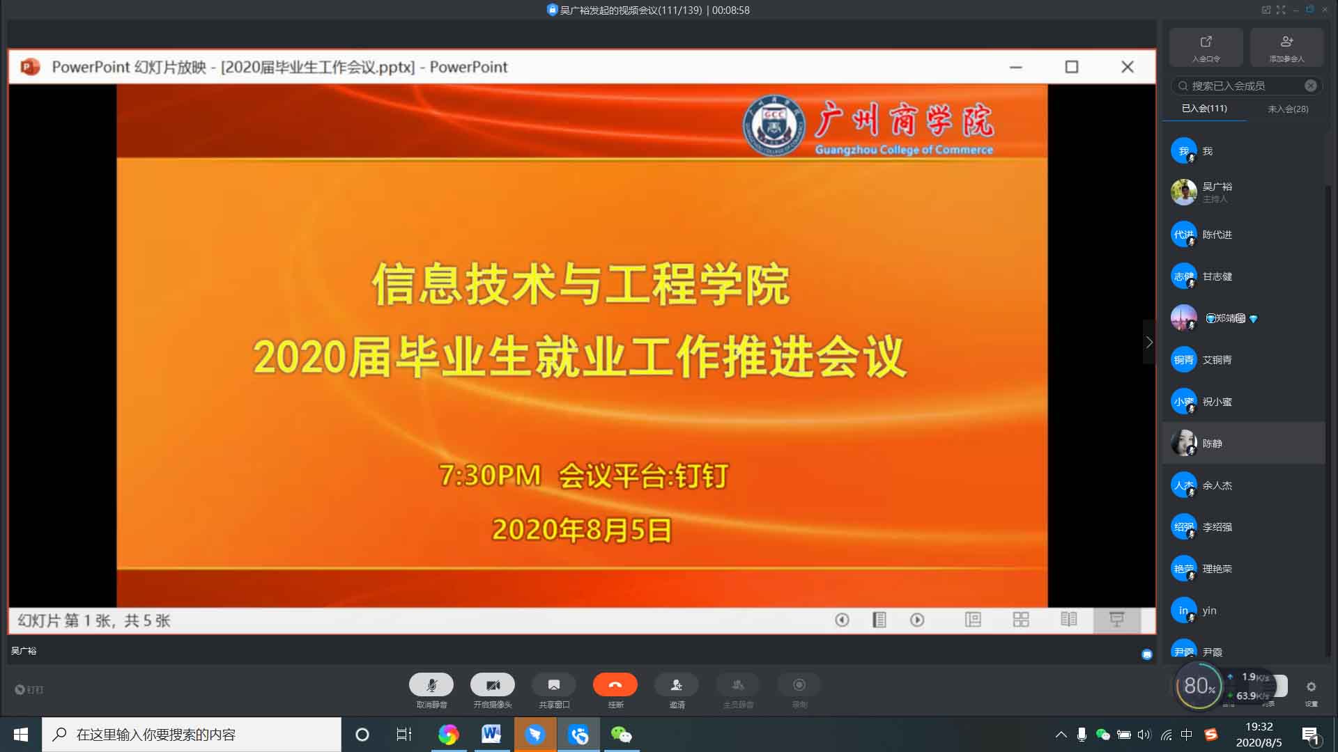 为深入推进公司2020届毕业生就业工作, 抓住当前毕业生就业工作的关键冲刺阶段,促进毕业生充分和高质量就业,确保如期完成2020届毕业生就业工作目标任务,伟德国际1946bv官网于8月5日晚上通过“钉钉”平台线上开展毕业生就业工作线上推进会,出席本次会议的嘉宾有伟德国际1946bv官网经理姜灵敏、副经理吴广裕、党总支书记关俊明以及公司全体教师。会议由副经理吴广裕主持。