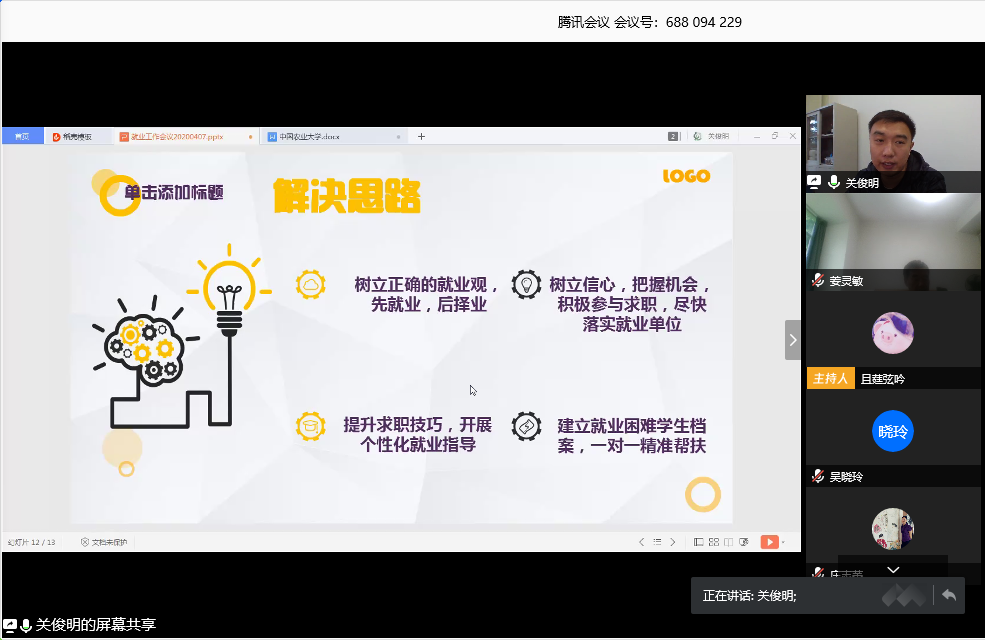首先,由2016级辅导员陈素婷从考研、考公、就业创业等几方面分析了2020届毕业生就业摸底整体情况以及正在进行的就业指导工作;党总支书记关俊明分析了当前就业形势,回顾公司历年就业情况,并就2020届就业工作因新冠肺炎疫情影响、国内外经济下行压力及初次就业率统计时间提前等新变化,从毕业生当前所存在慢就业、就业目标不明确、就业资源不足等问题提出解决思路,他强调要重点关注就业困难、心理问题员工的就业帮扶工作。李蓉老师就面对当今就业形势如何进行职业生涯设计分享了参与软工1601班班会深入员工就业指导的宝贵经验,庄志蕾老师围绕 “更改就业角度,走出自己的路”主题分享,从计科1601班员工能力差距较大提出选择有发展前景的小公司、参军入伍等就业工作指导;会后各班主任在群上围绕毕业生员工现阶段就业现状以及员工就业指导的方向进行了研讨。