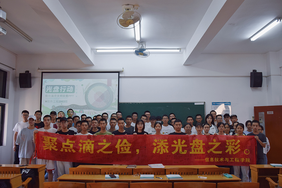 班会伊始,主持人通过分享故事,详细地介绍了“光盘行动”以及意义。接着,主持人展示了详细数据,向同学们科普了当今世界粮食紧缺与浪费粮食现象严重的事实,并鼓励同学们“节约粮食,杜绝浪费”。最后,主持人号召同学们宣读倡议书,并在横幅上进行签名。