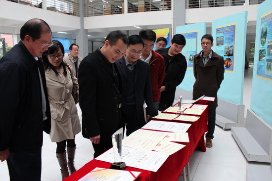 公司领导和师生观看计算机系省、国家级学科竞赛成果展