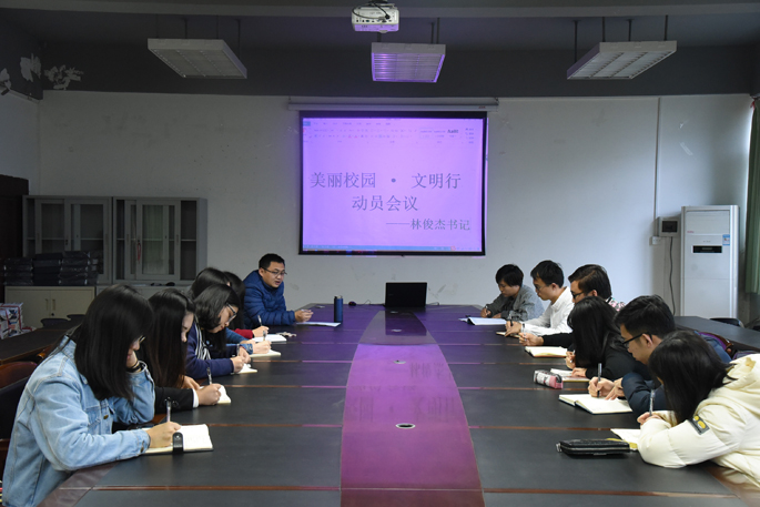 2017年3月7日中午在第六教学楼205召开动员会议。参加会议的有信息公司党总支林俊杰书记、团委书记王轻纱老师以及三大组织干部代表。会议上,林俊杰书记对“美丽校园·文明行”系列教育活动做出介绍,活动包括美丽校园志愿维护周活动、平安校园志愿维护月活动、爱心育苗植树节活动等校内外系列志愿活动,希望干部们积极落实活动。最后,王轻纱老师补充强调干部务必认真积极对待此项工作。