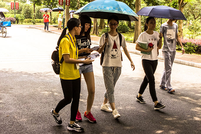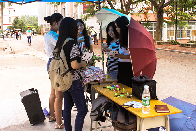 宣传的几天,烈日当空,来往同学们酷热难耐,都打起了太阳伞,躲避着阳光。但摆摊的工作人员仍然坚守着岗位,努力地做好宣传工作。在炎炎夏日里,可爱的宣传扇子作为本次摆摊活动中派发的精美礼品,吸引了不少同学前来询问毕业作品展的相关信息。面对同学们的提问,摆摊的工作人员都热情耐心地为其解答。而夏天的天气就像小孩子的脸,说变就变,午后倾盘大雨迅即而来,稍稍压低了高温,这让工作人员在随后的摆摊活动更加积极了,宣传单和小礼品也被派得飞快。