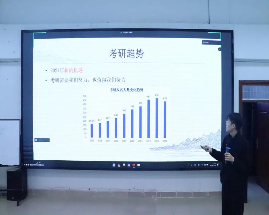会议伊始,吴广裕阐述此次会议的目的,简要介绍近几年考研的基本情况与考研内容。随后,宋宇涛从个人情况、考验动机、初试备考经验以及考研心得四个方面展开分享。他详细介绍了数学、专业课、英语等科目的学习要点,并提到,既要重视稳扎稳打的背诵,也要重视平衡学习与生活,要学会与焦虑等负面情绪共处,及时调整好心态。吴家俊与大家分享选择院校的动机,为同学们提供一个选择院校的方向。接着,他根据自身情况分享自己的考研经验,他分享自己在准备考研时所面临的心态问题以及解决问题的方法。告诉大家切勿放松警惕,须踏实复习,尽力达成每天的复习任务。