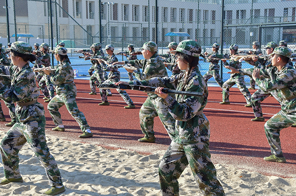 在教官“成刺杀操队伍散开”口令下,方阵在整齐、铿锵有力的正步声中由内而外迅速散开。“狭路相逢勇者胜,有我无敌,精忠报国……”,他们的声音在校园当中回荡。在教官带领下,新生们依次完成刺杀操各项动作,左砍右踢,如同军人般飒爽利落,展现强国有我的决心。操训练后,教官就此次训练进行总结,对每一个动作所存在的问题依次讲解,并对训练给予肯定,期望在接下来的训练有更大的进步。