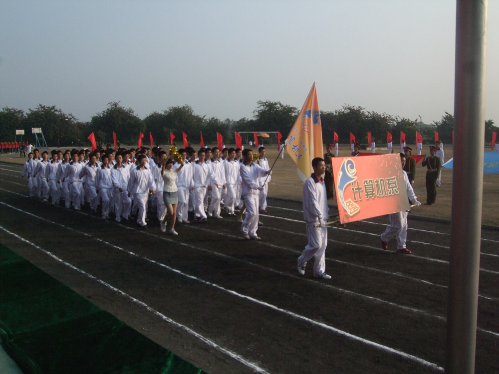 看,他们踏着金色的赛道代表着计算机系迎面走来。带着驰骋赛场,拥抱辉煌的信心踏向未来;带着诠释青春,挥洒汗水的信念走向希望。方阵的队员个个精神抖擞,逸兴遄飞,青春的光彩在脸上熠熠生辉。“乘风波浪,奔腾直上,计机创先,争优当前”,拉拉队员们热情高涨,不断为我系方阵呐喊助威,高昂的情绪带动了现场的气氛。
