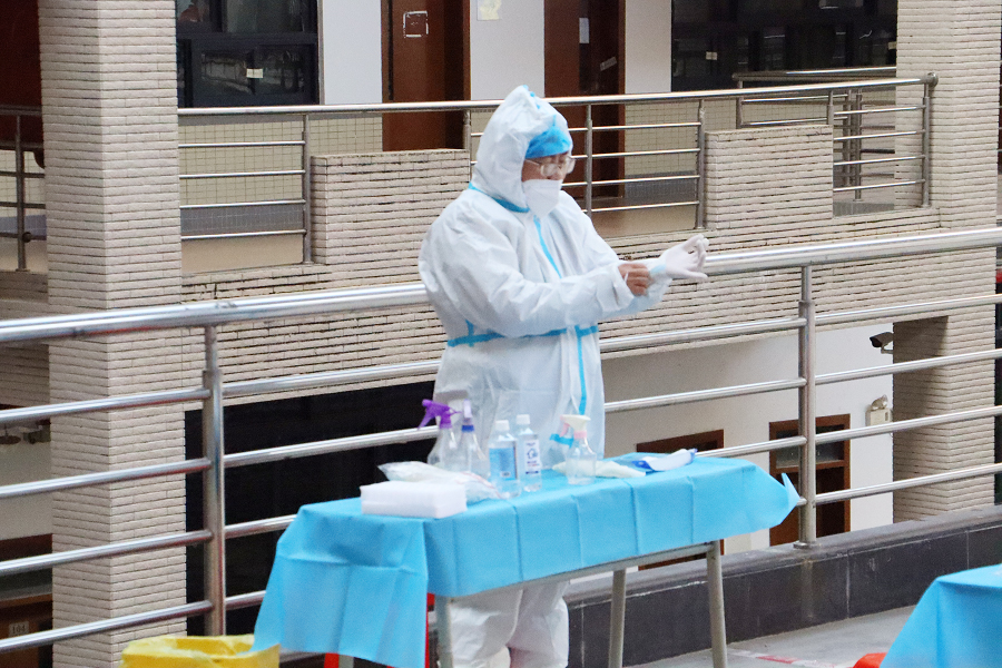 在核酸工作开始之前,志愿者和医护人员迅速布置好检测现场,为即将到来的核酸检测工作做好准备。早上8时核酸检测准时开始,志愿者迅速就位,组织维持现场秩序。经过工作人员的引导,同学们井然有序地向志愿者出示个人粤康码和粤核酸码。本次检测采取每10人为一组的形式,第一位同学负责领取试管和条形码,随后,小组各成员录入信息并按照顺序进行检测。而这种分组形式,也使整个检测工作更加高效安全地进行。