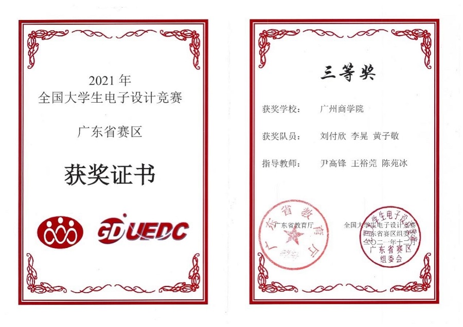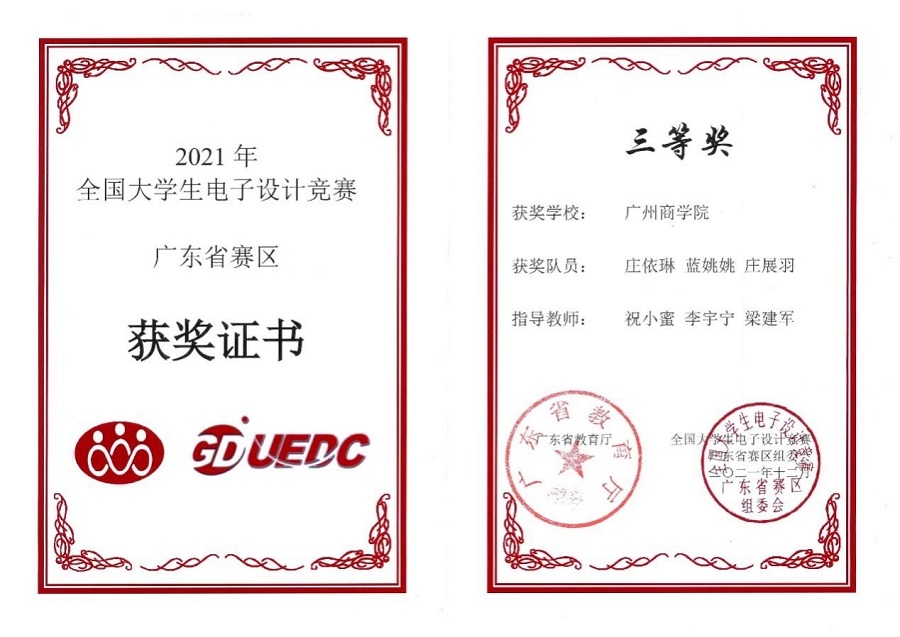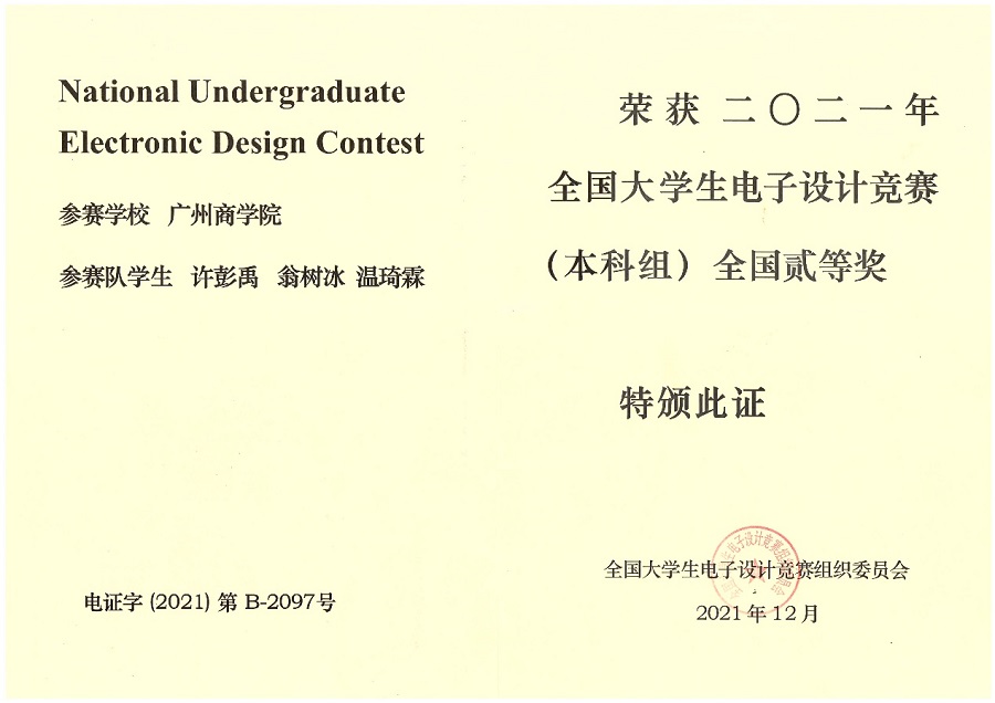 近日,由教育部和工业和信息化部主办的全国电子设计大赛成绩公布,伟德国际1946bv官网许彭禹、翁树冰和温琦霖3位同学组成的参赛队伍在2021年该项赛事中荣获全国二等奖的优异成绩。此外,伟德国际1946bv官网学子在广东省赛区同样取得优异成绩,共获得省赛一等奖1项,二等奖1项及三等奖2项。