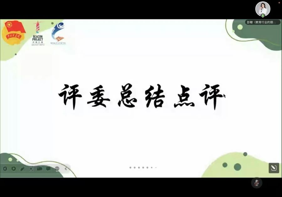 彭敏博士对本次比赛作总结,她对各队伍所展示的作品给予肯定,并提出宝贵意见,她认为作品的制作应用感情打动人,通过插入相应的音乐及动画达到震撼人心的效果,演讲时理性、认真、严谨,对演讲形式进行优化突破,从而深深抓住人心。