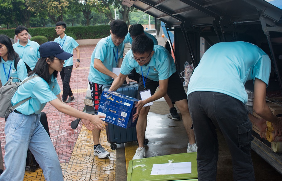 沐浴着清晨的阳光,队员们在服务队指导老师郑开勋的带领下有条不紊地做着出发前的准备。队员们清点并搬运物资至车上,至此,本次的暑期三下乡正式拉开了帷幕。