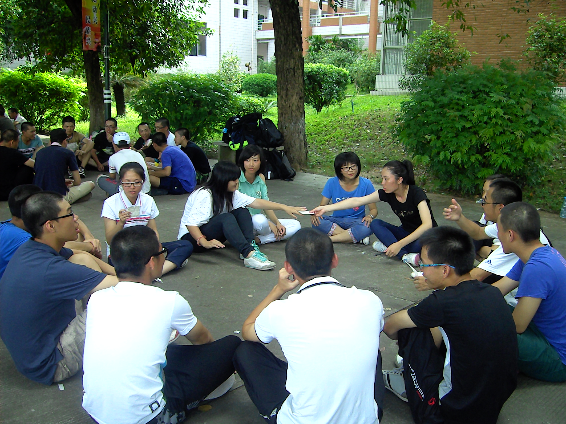 下午2点30分,活动正式开始,新生们早就在指定的地点排队等候各自的助理辅导员进行活动的安排。今天的活动主要有:“瞎子与哑巴”、记住你我他、“哑巴”排队、剪刀石头布、背我过河。起初,新生们都有点拘束,在老师和师兄师姐的热情引领下,大家都不知不觉地全心投入了各项活动中。首先是“瞎子与哑巴”,它需要通过两个人彼此间的信任与坚持才能完成。一个人不能通过语言而只能牵着对方的手来带领他走过各种有障碍的设施,直到回到出发地。活动中最常听到大家欢呼雀跃的是“剪刀石头布”,每一次的比试都能给大家带来许多惊喜和欢乐。大家也从中学会了相互信任、团结合作、彼此宽容。而“记住你我他”是最能够让彼此熟悉的一个活动。在此之中,大家都毫无顾忌地说出自己的名字、家乡和爱好,毫不保留、没有猜疑,很快大家便已相互熟识。