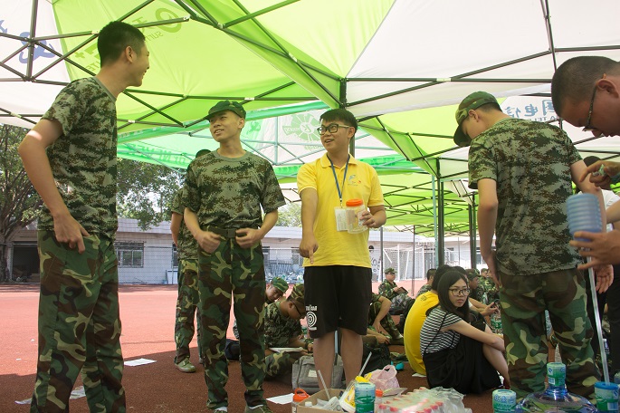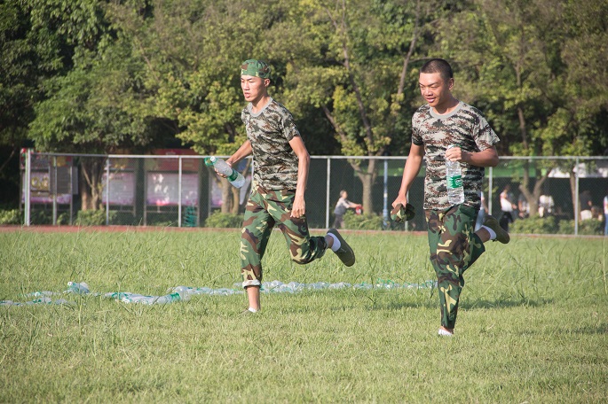 下午的足球场,太阳冷酷地灼烤着大地。新生们顶着烈日,以饱满的精神状态迎接下午的训练。公司还为新生们准备了凉茶,让他们在辛苦训练后喝上一杯清凉消暑的良药。过后,教官便组织新生进行军体拳训练和方阵训练,军体拳的队伍拳拳有力,斗志昂扬,打出了他们的风采,口号声喊出了他们的气势;方阵训练则是整齐无误,头上顶着的水瓶却丝毫不影响他们的训练,反而帮他们练就更加稳健整齐的队列,让人赞叹不已。