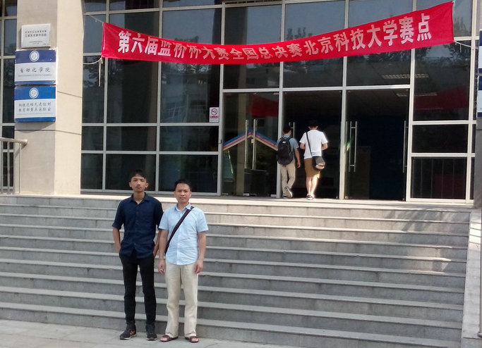 方泽生同学(左一)和指导老师梁建军(右一)在比赛点合影