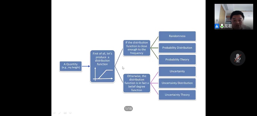 讲座伊始,龙君博士介绍了处理不确定性事件常用的六种数学方法,分别是概率论、模糊集理论、区间分析、粗糙集理论、灰色系统以及不确定理论。针对区间的运算律,以0.5<0.4为例证明了区间分析、粗糙集理论和灰色系统的自相矛盾。再以"身高恰好1米7"跟"身高不是1米7"的可能性相同,说明模糊集理论也是有问题的。于是研究不确定性事件的理论只剩下概率论和不确定理论。最后以罐子问题为例,龙君博士用通俗易懂的语言,讲解如何通过"事件出现的频率是否与其分布函数足够接近",来判断应该使用概率论还是不确定理论。他指出在当现实数据出现的频率与分布函数不接近(或无法确认是否接近)时,就不要使用概率论,而应该使用不确定理论。
