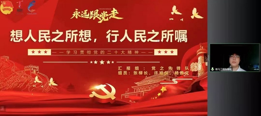 会议伊始“青马工程”培训班的学员按照小组进行了主题试讲。各小组分别从党的二十大主题、目的、意义、内容等四个方面讲述党的二十大精神。同时,“青马工程”培训学员号召新时代新青年员工将党的二十大精神贯彻到实践中去,坚持学习马克思主义思想,要坚定不移地听党话跟党走,坚定理想信念,为实现理想而努力奋斗,以青春之名,奋力迈向新征程。