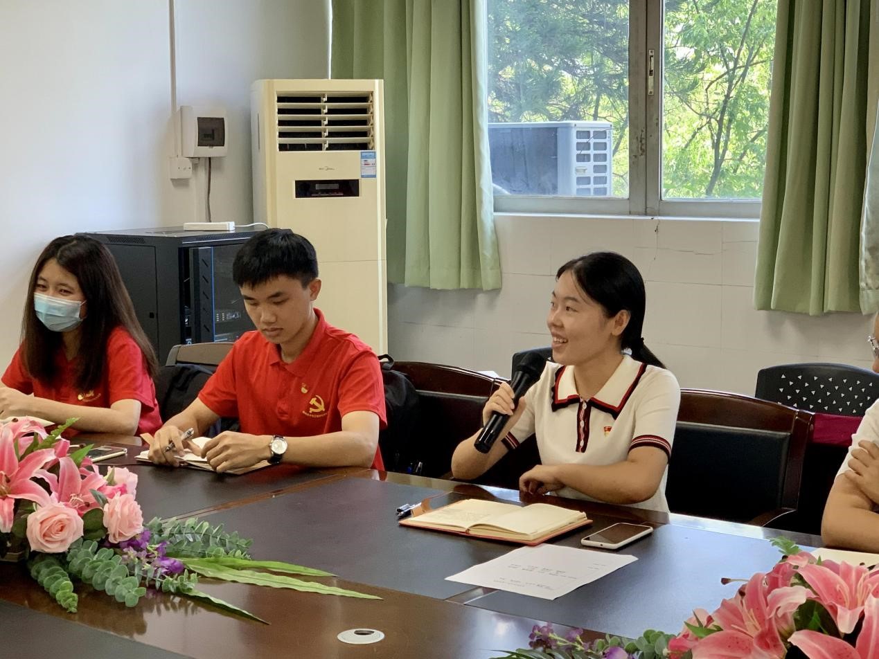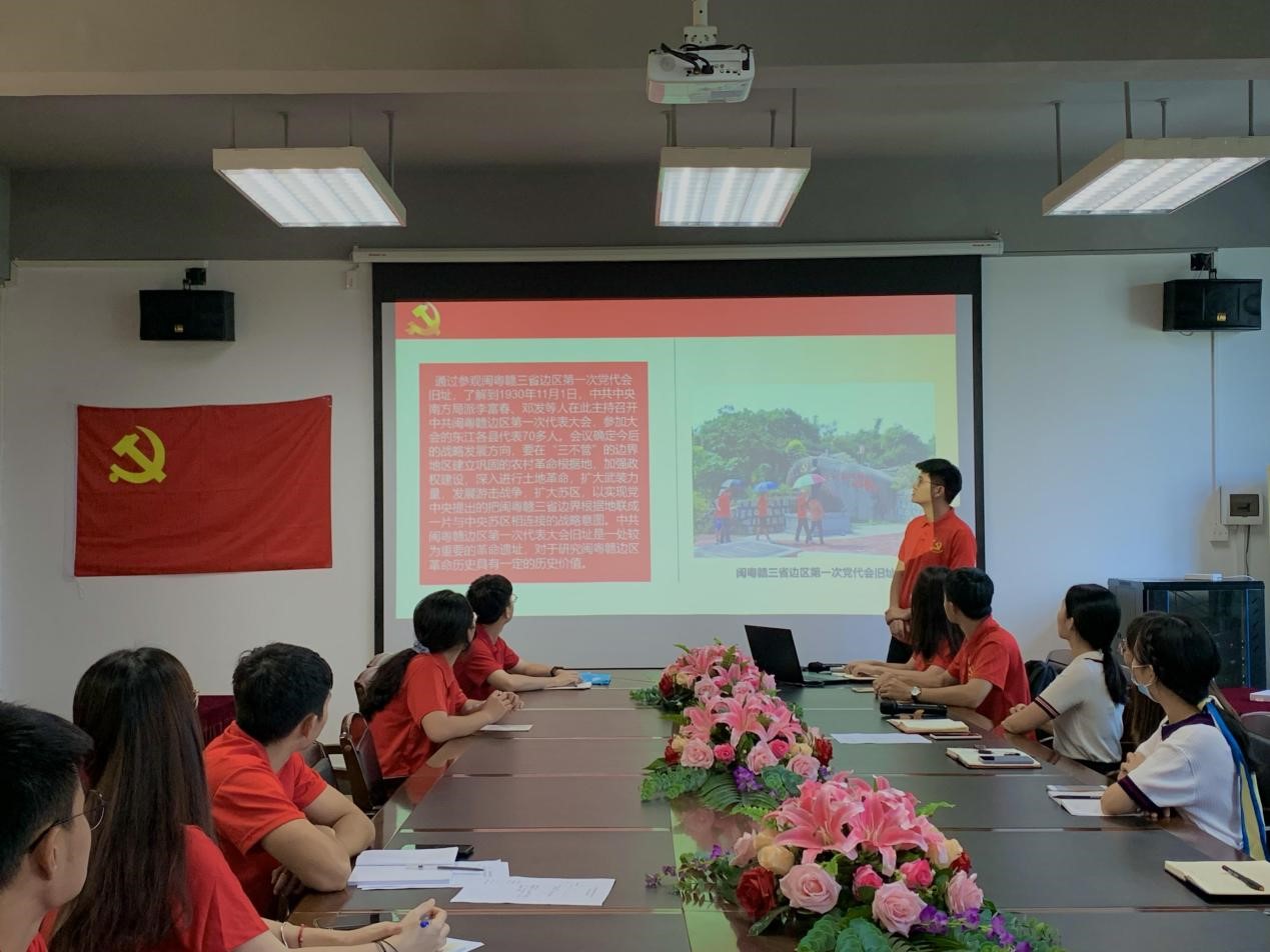 接下来各小组代表通过PPT的展示与讲解,为党员同志们分享暑期参观红色景点的经历、心得与体会。王璠同志分享了他在参观周恩来少年读书旧址纪念馆的感想,通过本次参观他了解了周恩来少年时的读书经历,感受着浓厚的历史氛围,他好像隔着时空看到了少年周恩来站了起来,对先生说:“为中华之崛起而读书”。黄超同志通过参观闽粤赣三省边区第一次党代会旧址和革命烈士纪念碑明白了如今安稳生活是多么的来之不易,我们应该永远铭记给我们幸福生活的人,让我们永远感恩那一个个为了这片土地,洒下热血的革命先烈们。李玲玲同志暑期来到广州起义烈士陵园,在其中的血祭轩辕亭中,她了解了陈铁军烈士和周文雍烈士两个人的伟大爱情,他们为了工作需要,做了半年的假夫妻,最终终于知道彼此是心中所爱却面临要上刑场的时候,他们丝毫没有退缩,丝毫没有求饶,他们慷慨就义他们为能够在天上做一对真正的夫妻而欢喜,他们为能为中国共产党、为人民牺牲而倍感欣慰,他们的精神是值得称颂的,他们的爱情是可歌可泣的,他们的品质是值得我们学习的。辛升烁同志分享了他在红场镇“大溪坝村”的体验,通过这次参观,他深感在伟大的革命战争中,中国共产党领导下的革命人民为革命事业,英勇奋战,坚贞不屈,前赴后继。许多同志为了革命的胜利,献出了宝贵的生命,烈士的崇高精神将万世长存,永远鼓舞着我们前进。