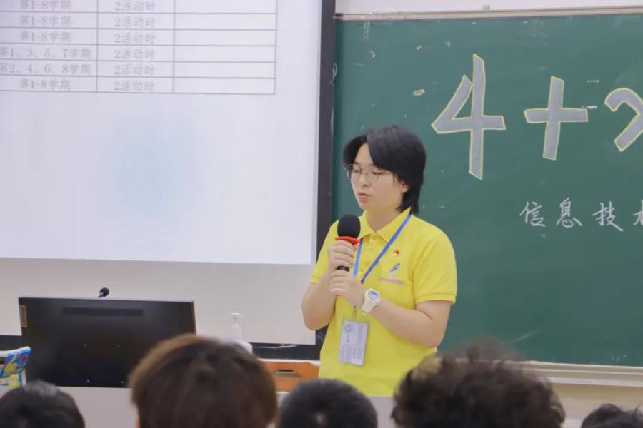 活动伊始,信院团委员工副书记陈幸儿、团委秘书长林子琦、员工会执行主席吴婧菲以及员工会秘书长徐少清分别从“什么是‘4+X’员工素质培养、学分学时的认定方法、‘4+X’的各项要求、如何获得‘4+X’学时”四个方面进行讲解。陈幸儿从“思想品德素质、法律素养、身心素质、创新创业素质、文体素质”五个方向详细介绍了“4+X”学时的内容,让新生们快速地对“4+X”学时有一定的了解。林子琦着重向新生们讲解学分学时的认定方法,使新生们理解了“4+X”学时的加分细则和学时的查询方式。吴婧菲则重点讲解了“4+X”的各项要求,通过她的讲解,使新生们明白了在参与公司各项活动的过程中遵守校规校纪的重要性。在如何获得“4+X”学时上,徐少清有独到的见解,通过她的分享,完善了新生们对公司“4+X”学时制度的认识。至此,本次2022级新生“4+X”宣讲会圆满结束。