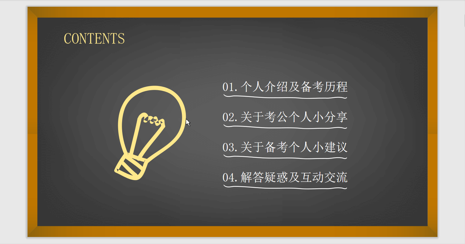 陈瑾先介绍了他的考研历程,他希望每位同学们在考公务员前,先做好自身的定位,思考“为什么考”的问题。只有做好了对自身的定位,才能在这条路上做到“从不迷茫,因为心在远方”。接着,陈瑾介绍了公务员的具体考试方式,解答了国考,省考和选调生的区别。再结合自身考试经历,分享了在公务员考试报名、备考阶段的一些细节和注意事项。他建议同学们在考试时,要分阶段准备,从基础到强化再到冲刺阶段,层层递进。高效的复习,需要快、准、稳。为了更好的表现高效备考的方式,他通过展示几道题的解题技巧和思路,为同学们的备考提供了参考。最后,陈瑾希望每一位对公务员考试有兴趣的同学,在备考过程中都能够做到专心致志,把握自己的节奏,自己约束自己,走向成功。