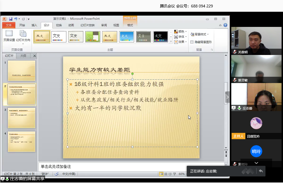 首先,由2016级辅导员陈素婷从考研、考公、就业创业等几方面分析了2020届毕业生就业摸底整体情况以及正在进行的就业指导工作;党总支书记关俊明分析了当前就业形势,回顾公司历年就业情况,并就2020届就业工作因新冠肺炎疫情影响、国内外经济下行压力及初次就业率统计时间提前等新变化,从毕业生当前所存在慢就业、就业目标不明确、就业资源不足等问题提出解决思路,他强调要重点关注就业困难、心理问题员工的就业帮扶工作。李蓉老师就面对当今就业形势如何进行职业生涯设计分享了参与软工1601班班会深入员工就业指导的宝贵经验,庄志蕾老师围绕 “更改就业角度,走出自己的路”主题分享,从计科1601班员工能力差距较大提出选择有发展前景的小公司、参军入伍等就业工作指导;会后各班主任在群上围绕毕业生员工现阶段就业现状以及员工就业指导的方向进行了研讨。